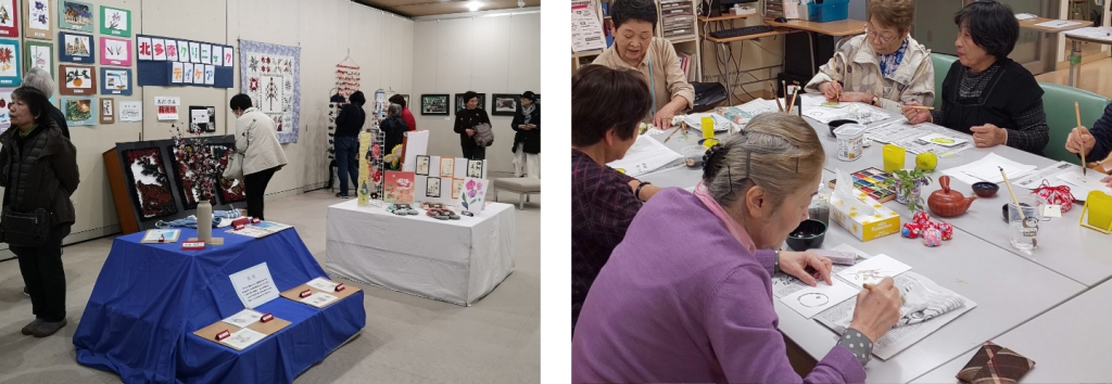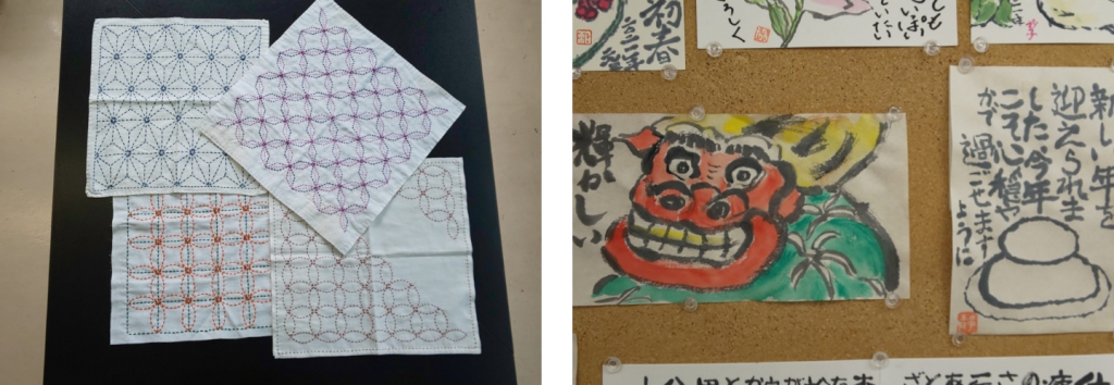 ご所さんと絵手紙、ちぎり絵、写経、習字、小物づくりに料理づくりなど、味を生かした生きがいづくりも